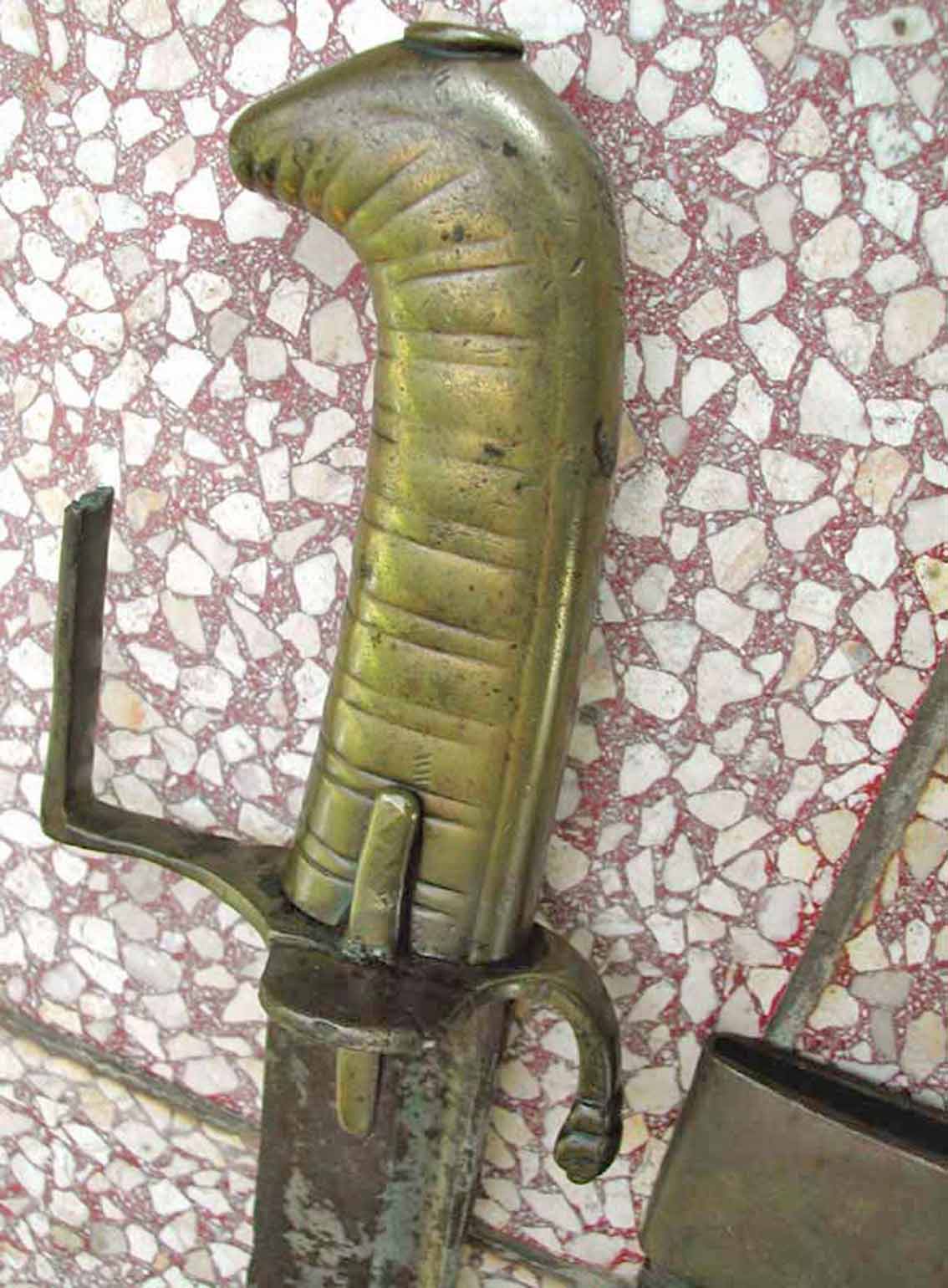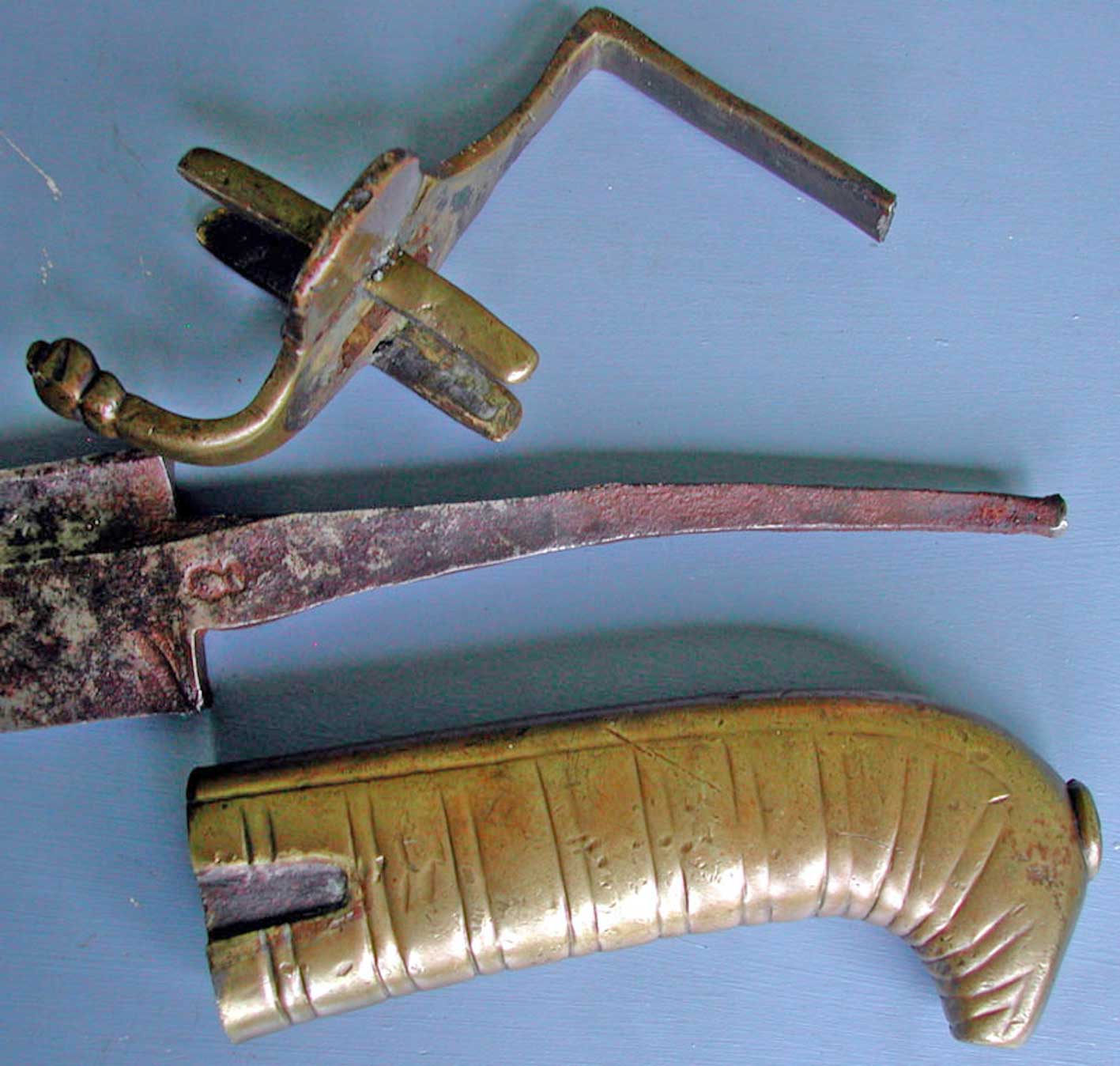 Eine interessante und handwerklich geschickte Arbeit führte zu dieser "Jagdplaute". Ein alter bayerischer Infanteriesäbel aus der Regierungszeit vom Maximilian I. Joseph wurde mit diversen nicht zusammengehörigen Teilen zu einer jagdlichen Waffe zusammen gebaut.