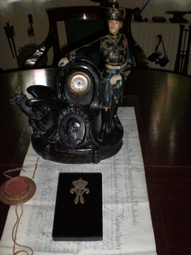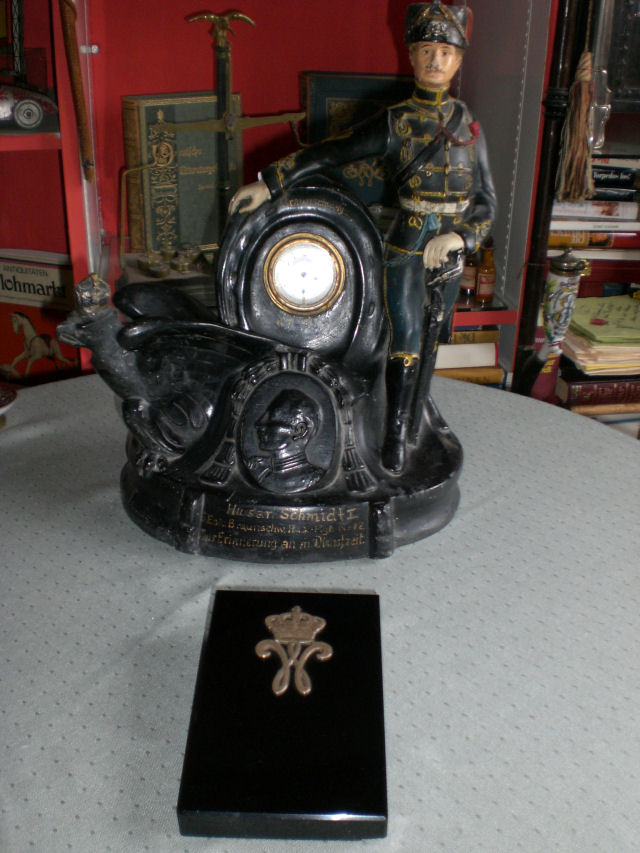 Hallo Sammlerfreunde,seit einigen Jahren ist dieser "originalgefasste" Husar i.meinem Besitz,einschl.orig.Uhr...davor, ein Briefbeschwerer aus schwarzem Glas,mit silberner Auflage.Der Briefbeschwerer soll angebl.aus d.Schloß i.BS stammen ?! Möglich ist alles,Gruß Sonjar