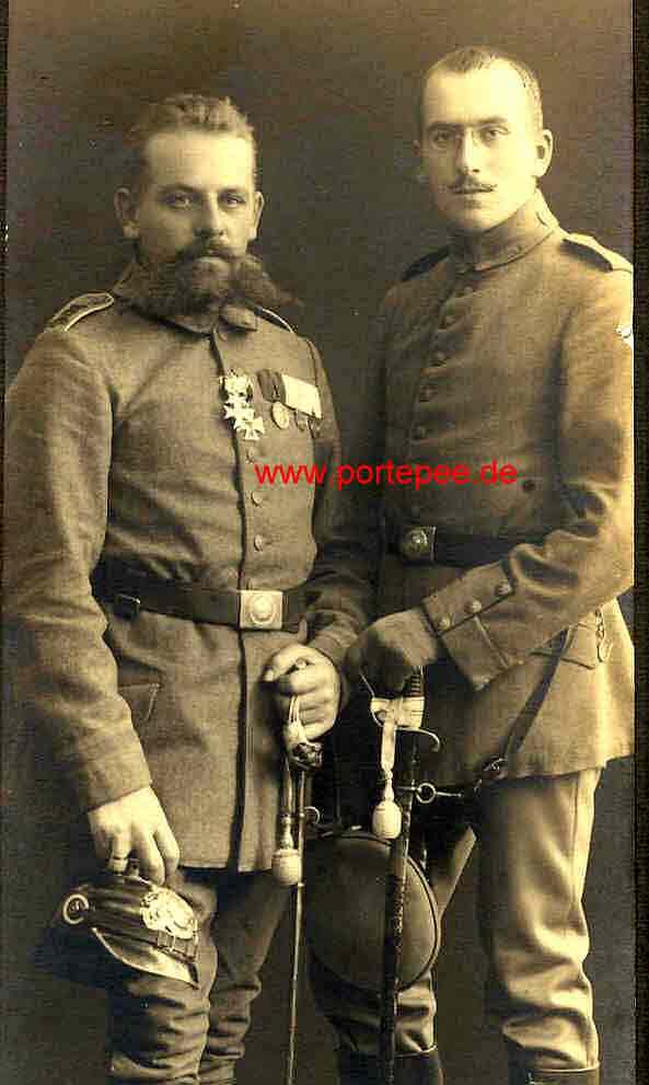 Feldwebel und Vice-Feldwebel aus der bayerischen Reserve Sanitäts-Kompagnie Nr. 8. Nach der Ausschnittvergrößerung könnte man meinen, daß das Portepee für Berittene am bayr. Infanterie-Offizier-Säbel (I.O.S.) befestigt ist. Wo hingegen sich am bayr. Artillerie-Offizier-Säbel (A.O.S.) die Ausführung für Fußtruppen befinden könnte.