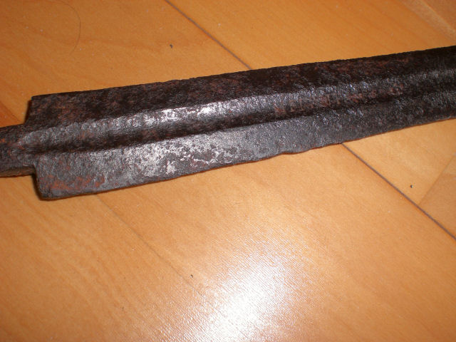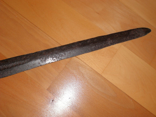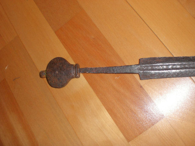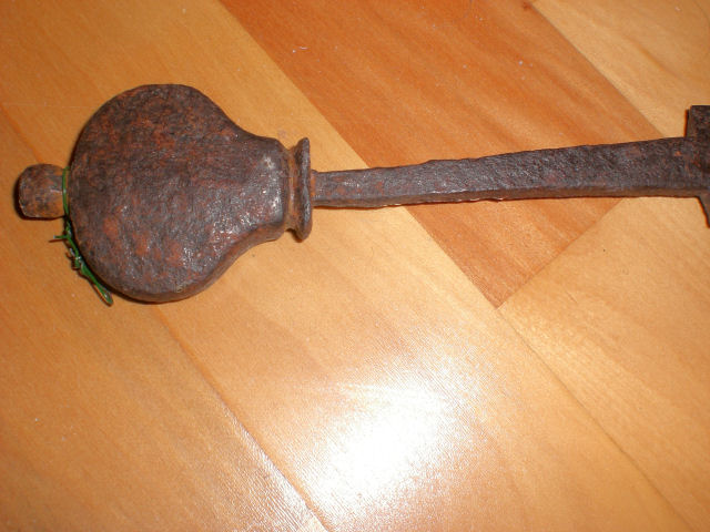 Hallo Thomas,die beidseitige Möglichkeit für eine Inschrift bietet sich auf einer Länge von jeweils ca.23 cm.Beide Seiten sind offensichtl. beschrieben,aber nur eine gibt etwas von IHREM Geheimnis preis,ohne Garantie auf Richtigkeit." MEL..TT......TOW...".Leider, hat der Rost schon zu viel Substanz vernichtet.Man glaubt, jetzt ist ein weiterer Buchstabe sichtbar,aber beim weiteren HINSEHEN ergibt sich doch keine..wirkliche.. Lösung.Fachleute mit der nötigen Kenntnis,haben event.den ALLES ENTSCHEIDENDEN BLICK dafür.Welchem Zweck, diente das kleine Loch im Knauf,war dort eine Markierung eingelegt,oder war ein Stift mit der Angel verbunden,zwecks weiterer Befestigung,denn der Knauf ist ja schon vernietet.Gruß,Sonjar