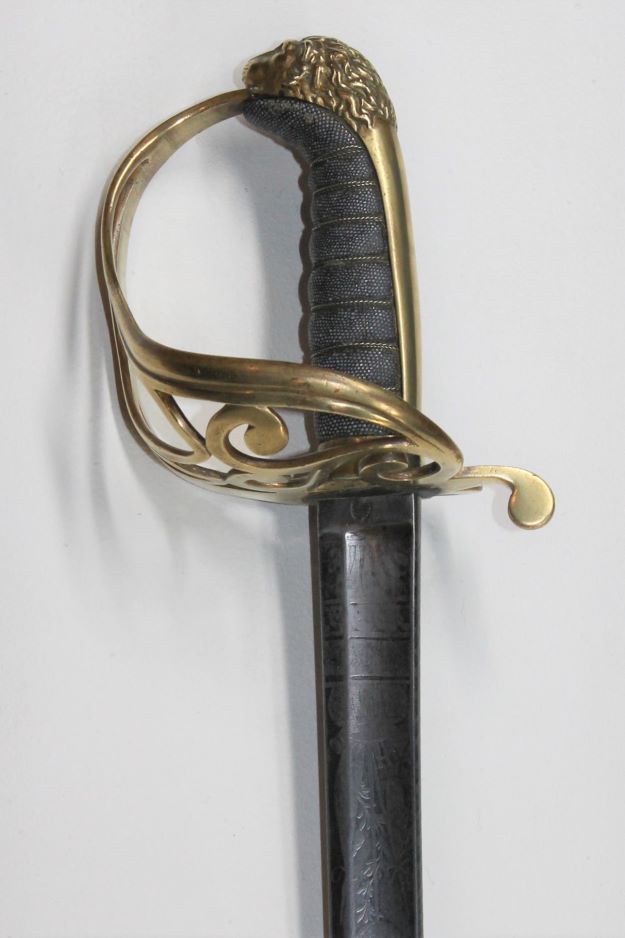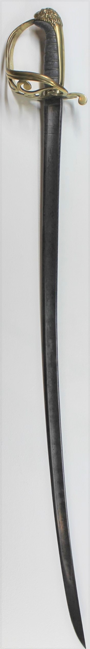 Das Stichblatt hat eine nach unten gebogene Parierstange mit Endknopf. Der gerippte Griff ist mit hellbrauner Fischhaut beledert und mit Kupferdraht belegt. Er hat eine ganze Kappe mit Löwenkopf und unten den Griffring mit kleiner Öse für das Portepee. Die volle Steckrückenklinge hat eine Spitze mit Schör und ist poliert. Sie trägt im oberen Drittel beiderseits Ätzungen, nämlich auf der Terzseite einen unklaren gekrönten Anker, auf der Quartseite die gravierte Widmung