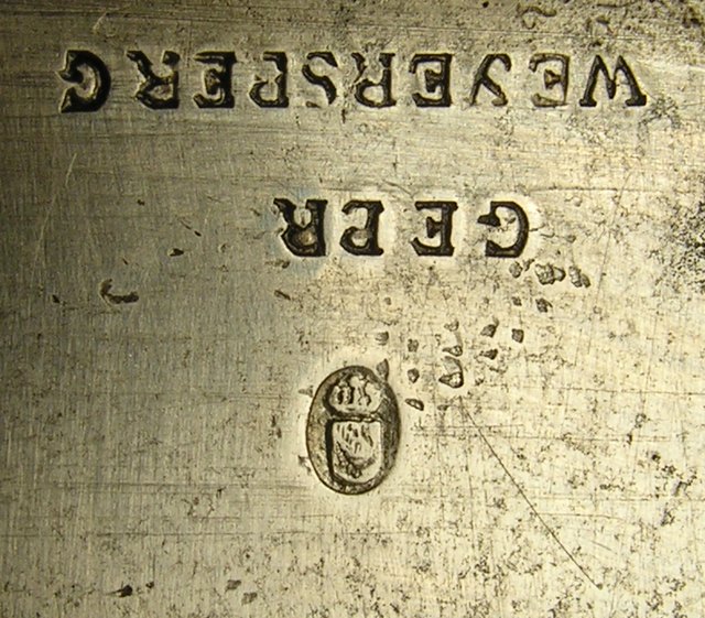 Der badische Infanterie-Offizier-Säbel von 1856 der 109er hat häufig den Stern des badischen Hausordens wie einen „Gardestern“ auf der äußeren Griffseite. Daß dieser Stern hier auf dem Griffbügel eingeätzt wurde, ist eine recht seltene Variante. Was mich aber noch mehr überraschte, war der badische Abnahmestempel in Form des Wappens über Gebrüder Weyersberg. Was also für ein dienstlich geprüftes und ausgegebenes Stück spricht.