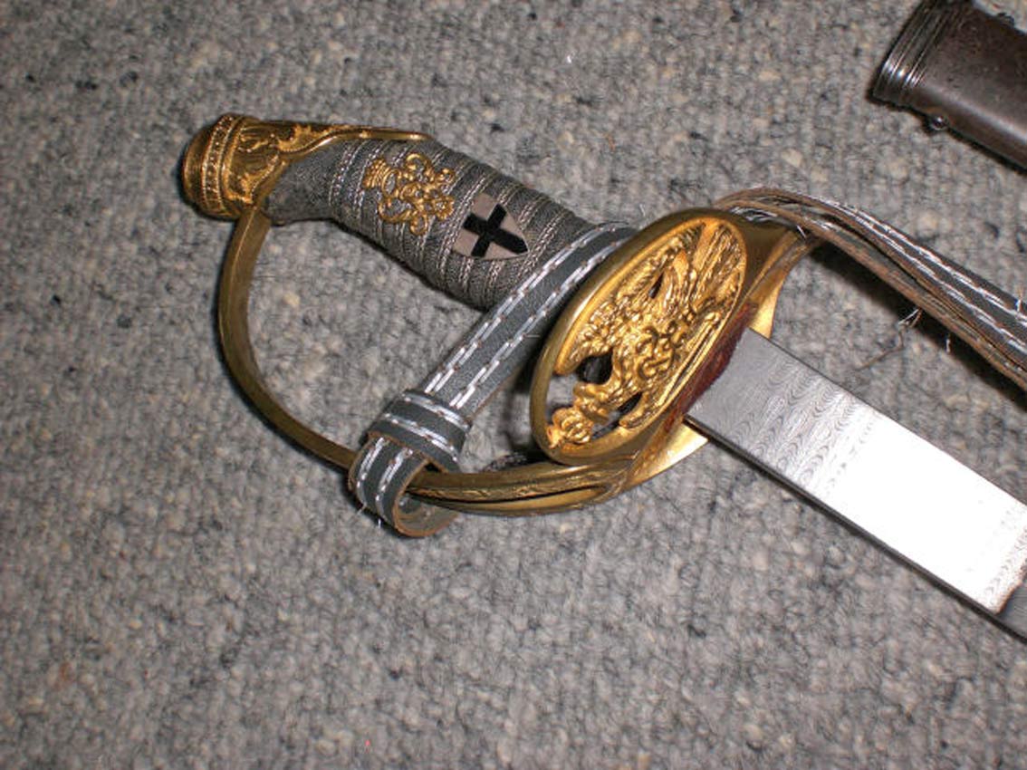 Zu der geschwärzten Scheide mit 2 Bändern und Ringen würde normalerweise ein preußisches Portepee mit 3 Durchzügen am Band gehören.