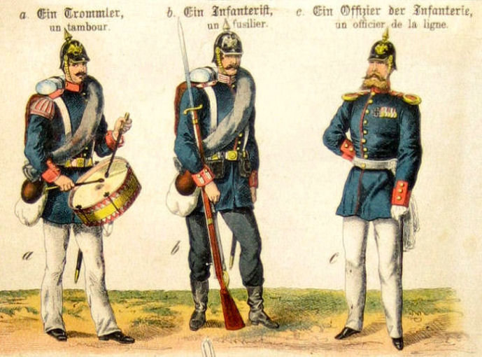 Dies sind Fotografien eines zeitgenössischen ca. 30 x 40 cm großen Teilstückes einer dieser typischen rückseitig mit Leinen kaschierten aufrollbaren Schultafeln. Auf dem Reststück sind noch Jäger, Schäfer, Handwerker, Matrose, Seeoffizier, Briefträger und Schutzmann abgebildet. Der Trommler ist auf der Tafel ca. 10 cm hoch.