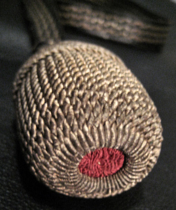 Ich benötige Hilfe bei der Bestimmung dieses eher zierlichen Portepees mit 1,4 cm breitem schwarzem Lederriemen, Gesamtlänge 44 cm, Kranzdurchmesser ca. 3,2 cm, ovale Form.