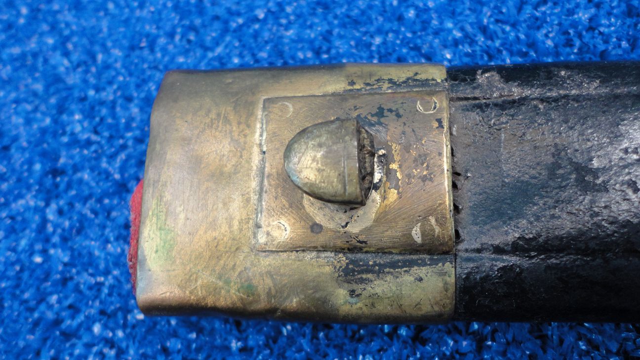 Scheide bis auf den abgebrochenen Tragehaken und dem ergänzten Ortblech noch ganz brauchbar.