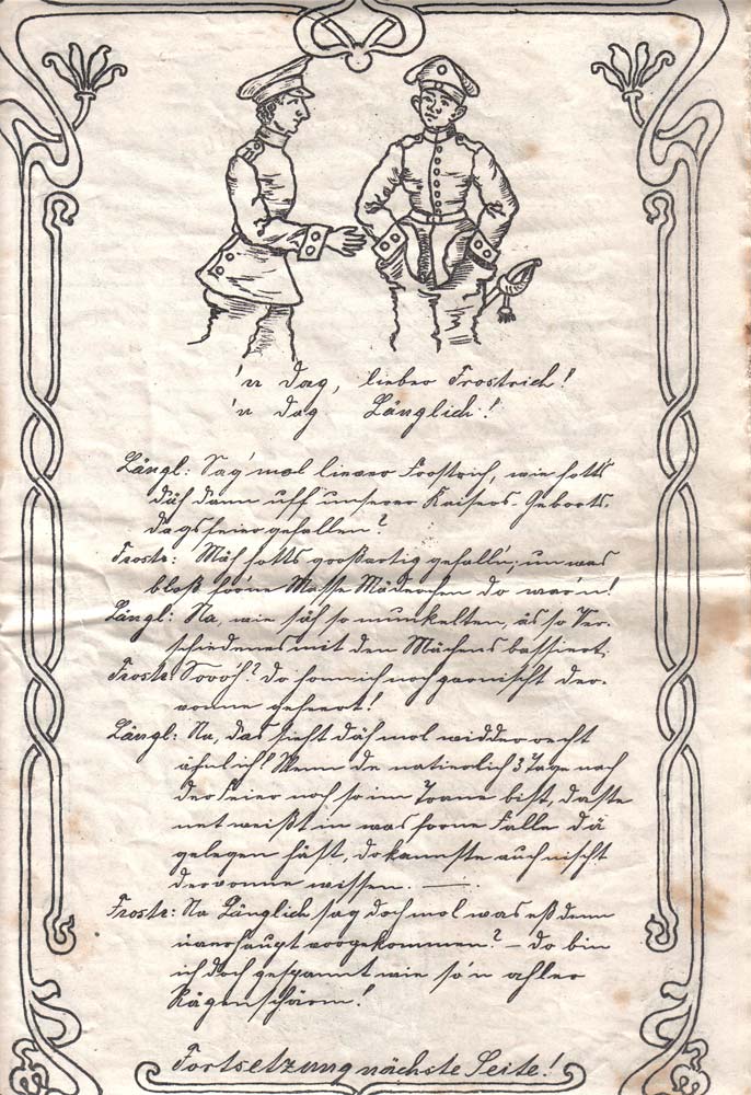 Interessant ist, neben dem Zeitkolorit, der aus diesem aus purer Freude und Stolz geborenen Gemeinschaftswerk atmet, vor allem die letzte Seite, auf der sich die Teilnehmer mit Ihrer Regimentszugehörigkeit verewigt haben: Art + Pi 11, Hus 14, Inf 83 + 167, Drag 5 ...