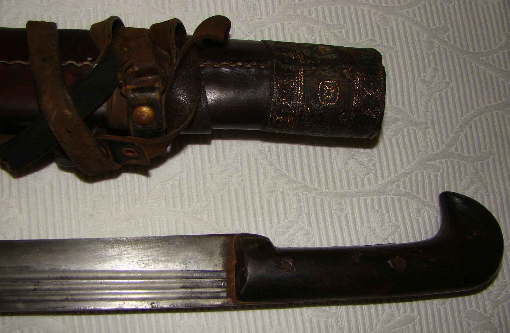 Griff aus Horn, Scheide aus beledertem Holz (restauriert - Stück Leder unten erneuert, sonst alles original).