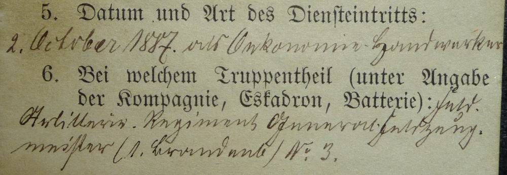 Eintragungen von 1887 (Diensteintritt), bis mindestens 1897, 8 Jahre nach seinem Dienstzeitende.