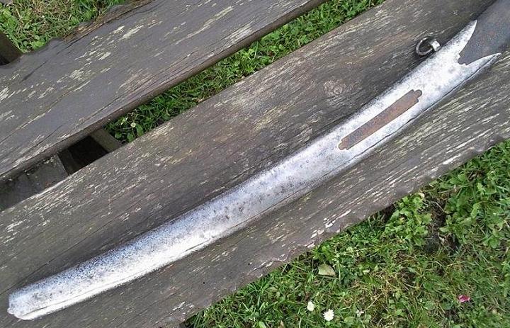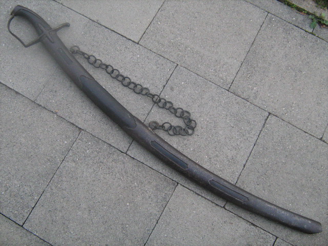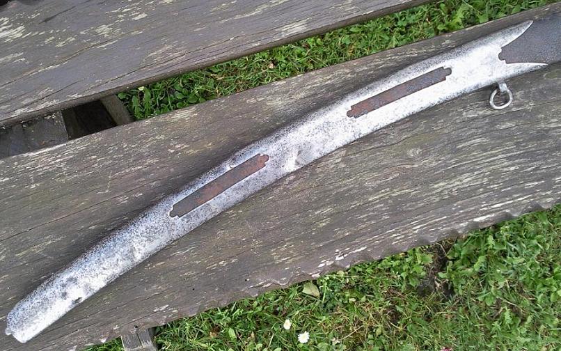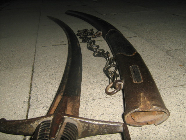 Heute hatten die Handwerker Pause, dafür war das Wetter für Fotos nicht ideal. Aber ich denke, das Wichtigste kann man erkennen. Gesamtlänge dieses Exemplars (o. Sch.): 103, 5 cm, Klingenlänge: 90 cm, Klingenbreite 3, 7 cm.
