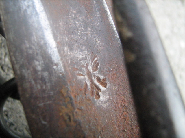 Klinge mit Adlermarke und "Reißhaken", der untere Beschlag der Scheide an der Außenseite mit 2 Durchbrechungen, an der Innenseite nur eine.