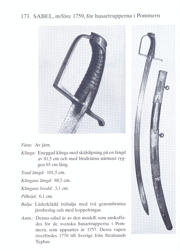 Es ist jedoch gesichert, dass schon 1757 die Truppe mit einem Husarensäbel nach preußischen Vorbild ausgerüstet war. Solch einen Säbel konnte ich jetzt erwerben. Da sieht man noch sehr stark die Ähnlichkeit. Vermutlich wurden einfach im Zeughaus Stralsund Säbel der preußischen Husaren kopiert - natürlich mit Abweichungen. Wenn man sich die Scheide ansieht, so wird die Ähnlichkeit noch deutlicher. Der Säbel m/1759 hatte schon eine Scheide, ähnlich dem Husarensäbel von Corrado. 1770 wurden diese Säbel nach Stockholm überführt. Mein Stück wurde um 1810/20 mit einer Klinge vom Dragonersäbel m/1770 versehen. Denn wenn damals gut kopiert wurde, hat man mit Sicherheit auch die Pfeilhöhe kopiert. Zu sehen auch an dem Stück im Buch. Da dieser Teil der Geschichte vom Datum her sehr gut einzugrenzen ist, kann man mit einiger Sicherheit sagen, welche Säbel bei den Preußen zu der Zeit genutzt wurden.