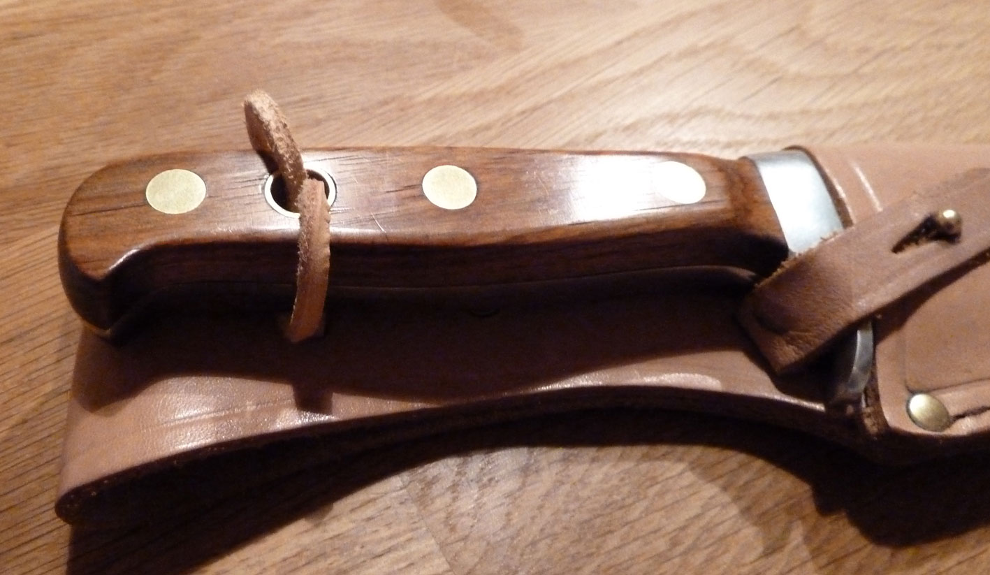 Hier einmal die Griffsicherung mittels Lederriemen an einem Puma Automesser.