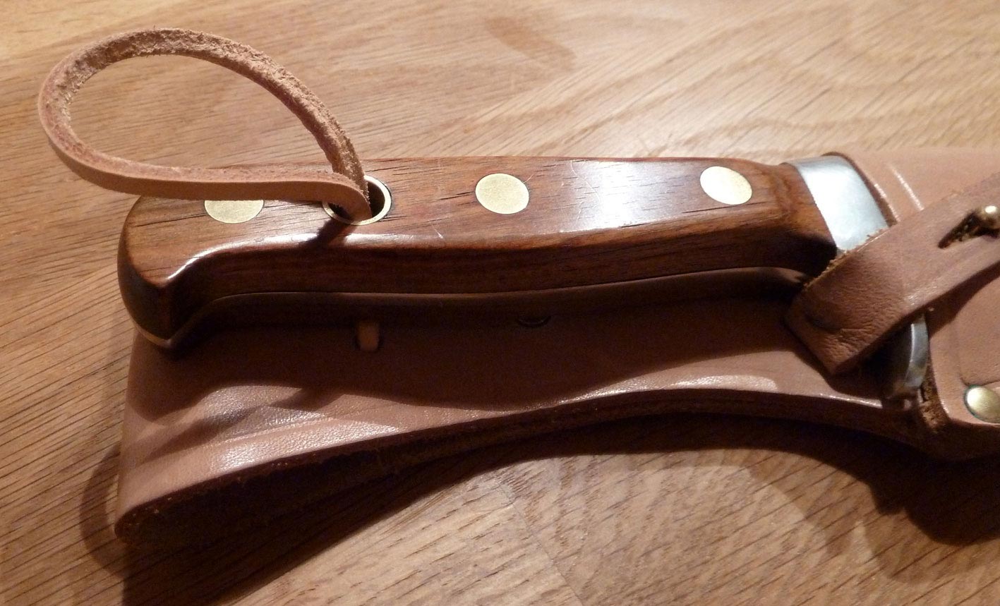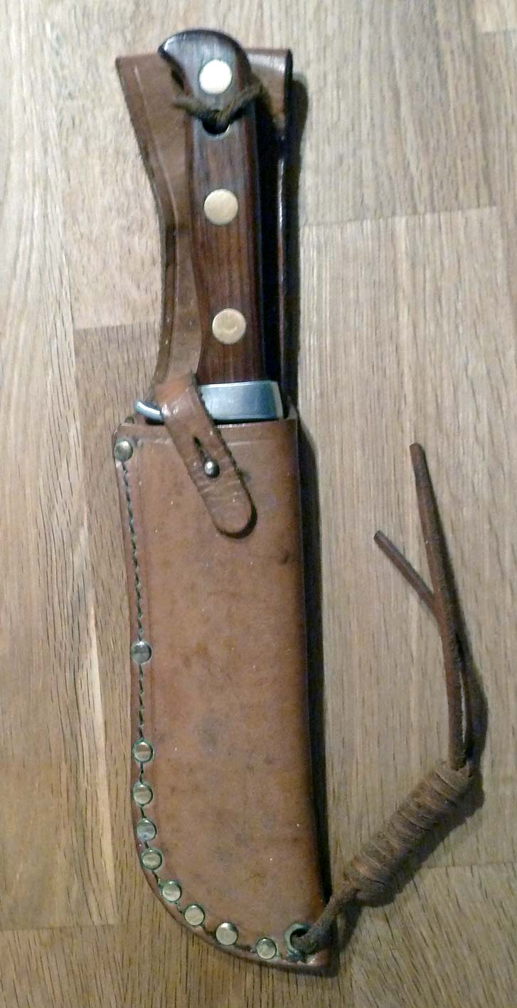 Hier einmal die Griffsicherung mittels Lederriemen an einem Puma Automesser.