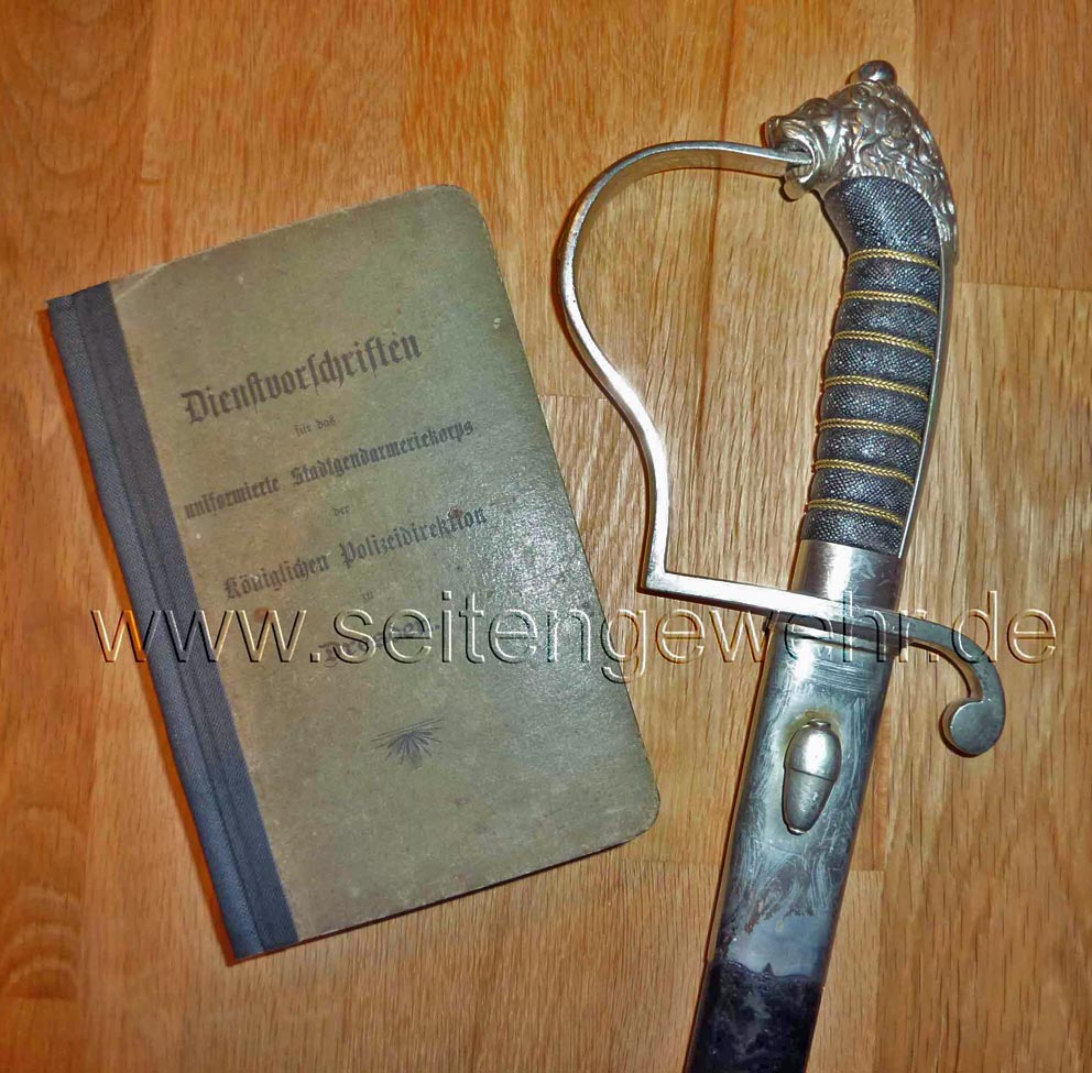 Signaturen: Herstellerstempel P.D. LÜNESCHLOSS Solingen und Abnahmestempel in Form eines gekrönten gotischen Buchstabens sowie die Zahl 93 als Jahr der Übernahme in den Staatsärar 1893. Polizeistempel unter der vorderen Parierstange: S.P.D.421.