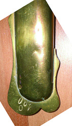 Mir liegt eine stark zerbeulte Messingscheide vor, die auf dem Schleppeisen "0" = Ausschuss und "190" = Waffen- Sammlungsnummer? gestempelt ist
