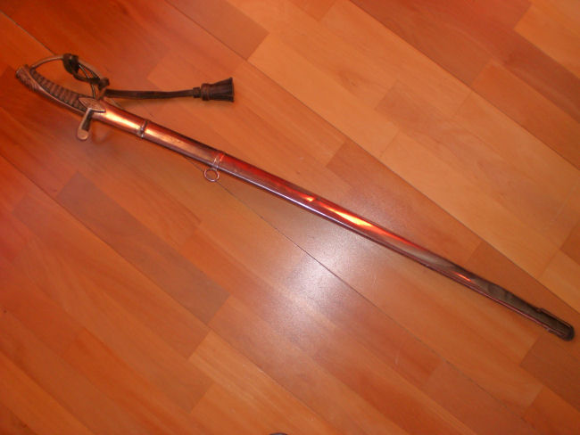 Hallo Forum,wer kann mir bei der genauen Bestimmung dieses Säbels weiterhelfen.Eisernes Gefäß mit zwei Nebenbügeln,Mitteleisen mit Blütenverzierung. Griffkappe, mit eingegossenem poln.Adler.Hilze aus stark geprägter Rochenhaut.Wicklung,ein in sich gedrehter Silberdraht.Keine Herstellerangaben vorhanden.Vernickelte Eisenscheide,oberes Ringband m.Öse,unteres m. Ring.Gesamtl.100cm.Klingenl.78cm.Breite 3cm.Gruß,Sonjar