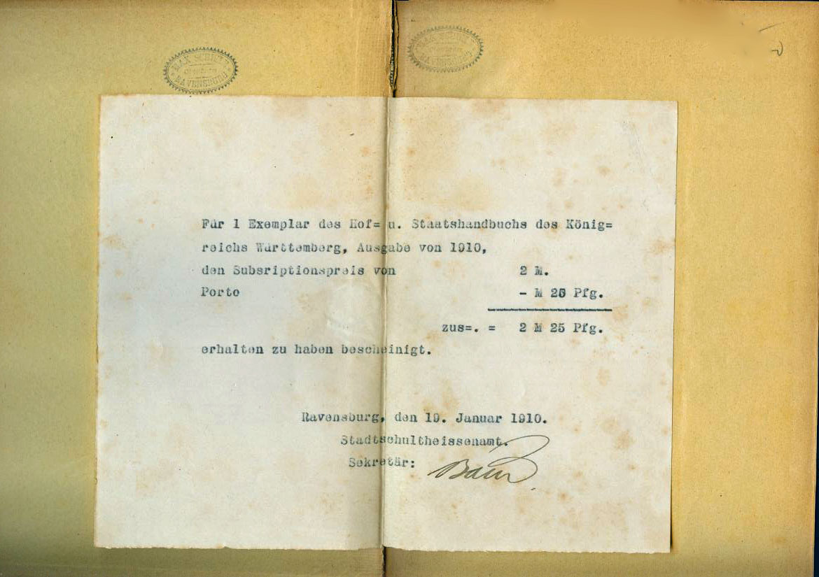 Dieses jährlich erschienene Buch ist an sich nichts ungewöhnliches. Spaß macht aber die im vorderen Buchdeckel eingeklebte Kaufquittung und die zwei eingelegten Bilder. Möglicherweise handelt es sich bei diesen 1917 datierten Aufnahmen auch um den Besitzer des Buches, den Oberförster Max Schiele aus Ravensburg.