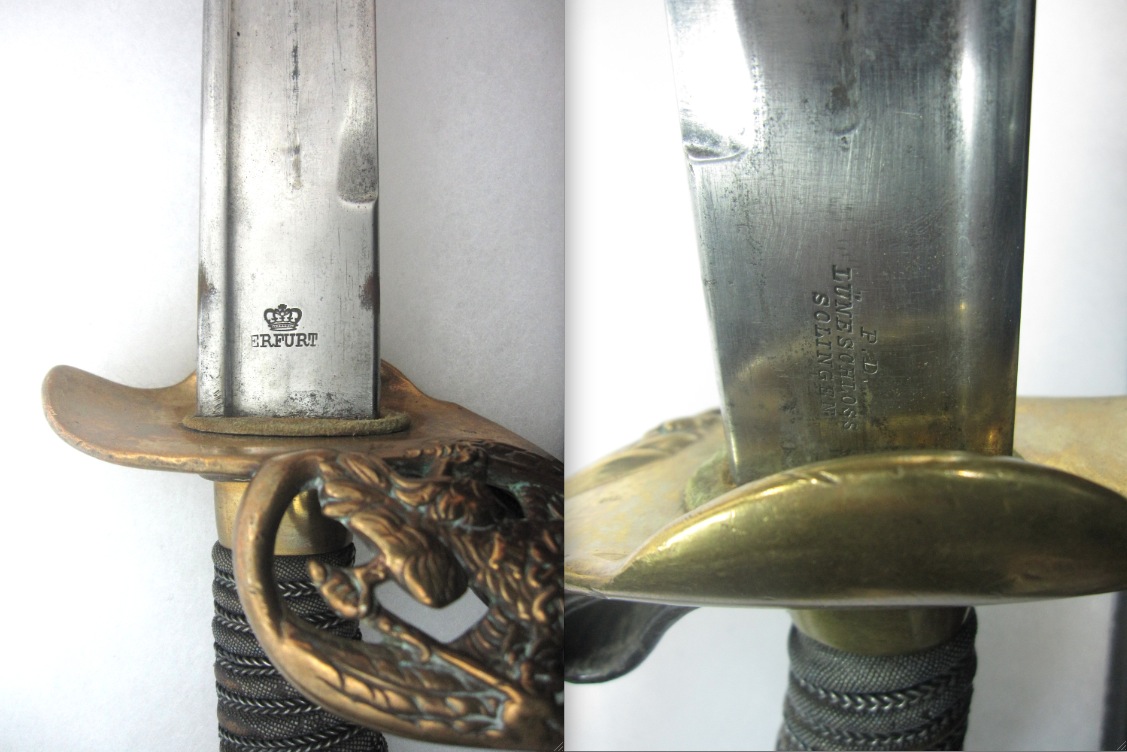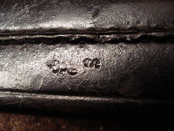 Die Stempel: "Buchstabe unter Krone" sind Stempel der preußischen Abnahmebeamten, die dafür Sorge zu tragen hatten, dass das "Bauteil" innerhalb der vorgeschriebenen Maßtoleranzen und auch ansonsten ordnungsgemäß gefertigt wurde. Der Buchstabe unter der Krone bezeichnet den Anfangsbuchstaben des Nachnamens des jeweiligen Beamten. Ich erkenne die Buchstaben: "F" auf dem Seitengewehr und vielleicht: "G" (schwer zu erkennen) auf dem Ortblech.