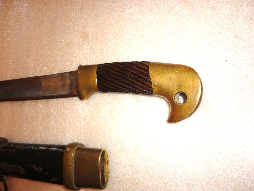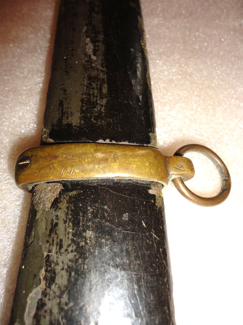 Klinge mit breiter Hohlkehle, Spitze in der Mittellinie, Fehlschärfe gestempelt: A,A überkrönt,48 (Waffennummer?), Terzseite:Fabrikmarke Slatous,1908.Holzscheide überzogen mit gummierter Masse (Leder?)Auf dem Ortblech kyrillische Buchstaben.