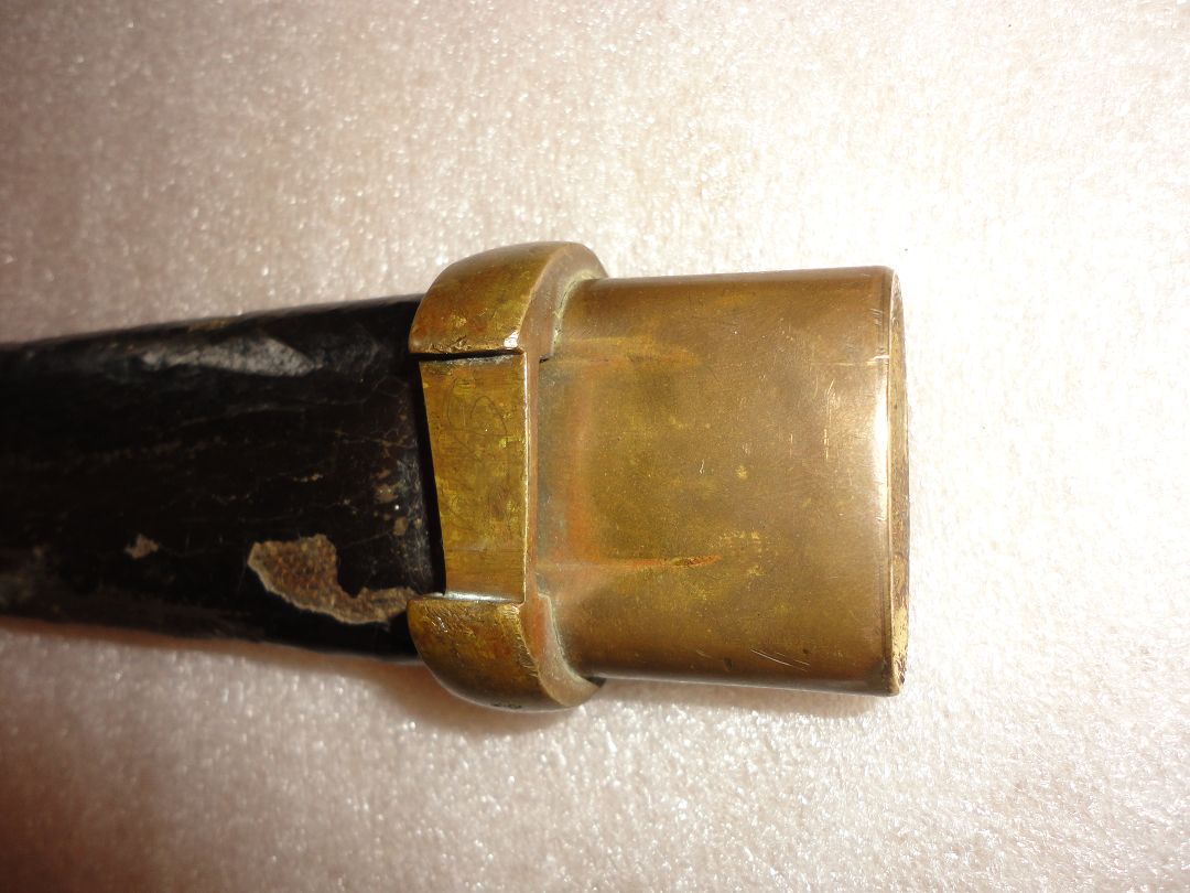 Klinge mit breiter Hohlkehle, Spitze in der Mittellinie, Fehlschärfe gestempelt: A,A überkrönt,48 (Waffennummer?), Terzseite:Fabrikmarke Slatous,1908.Holzscheide überzogen mit gummierter Masse (Leder?)Auf dem Ortblech kyrillische Buchstaben.
