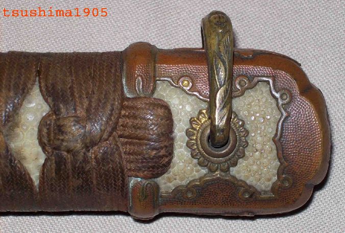 Öse und Tragering (hier wie im Original aus Stahl) wohl durch eine Reparatur im Felde ersetzt. Die Bohrung für den Ring ist allerdings fast schon wieder durchgerieben … Die Lederschlaufe ist ebenfalls nur ein feldmäßiger Ersatz. Der Lack und das Blech der Scheide sind unterhalb Ashi durch Handschweiß angegriffen.