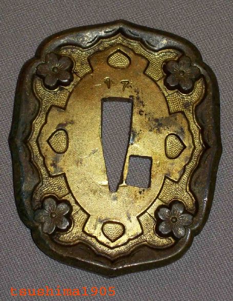Tsuba mit beidseitig je 4 Seppa, hier wie auf (fast) allen anderen Teilen eine eingeschlagene „17“ sowie Kerben. Die Ziffern auf den oberen und unteren Seppa befinden sich ausnahmslos jeweils auf der der Tsuba zugewandten Seite.