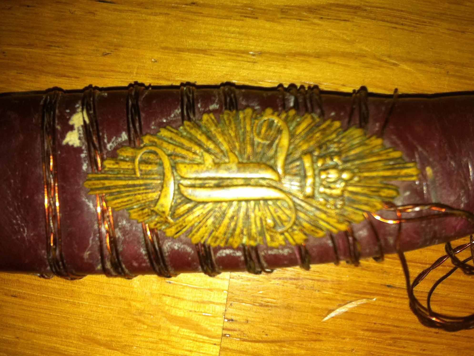 Ein wirklich heiße Zusammenstellung. Das Griffstück mit eingelassener Kartusche dürfte vom Säbel einem bayerischen Landwehr- / Bürgerwehr-Offiziers stammen. Vorbild war der bayerische Jäger-, bzw. Infanterie-Offizier-Säbel von 1836 bzw. 1838. Der „L“ im Strahlenkranz steht für König Ludwig v. Bayern.