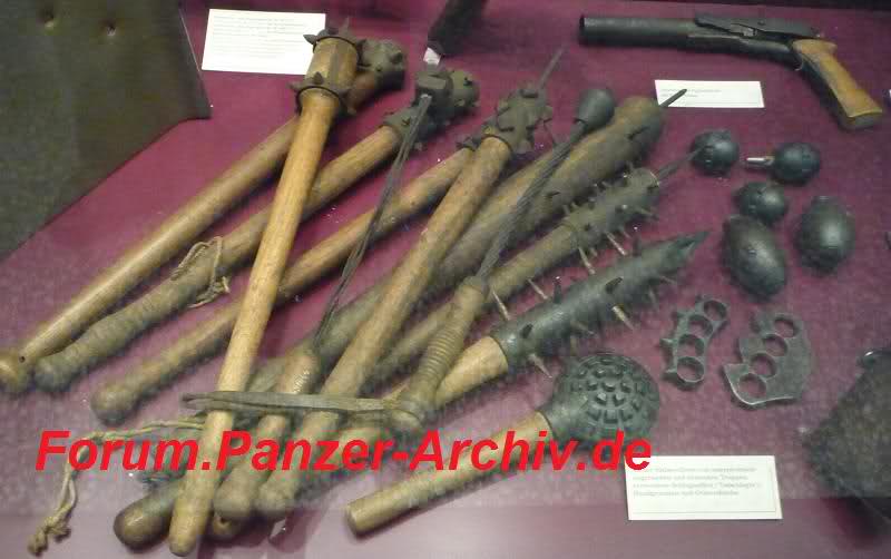 Also als Waffe kann man diese primitivste aller Instrumente nicht mehr bezeichnen. Und wenn sie noch so Serienmässig, vom Etatplan entworfen und ausgegeben wurden! Man muss noch hinzufügen das neben der endlosen Menge an selbst gebastelten Keulen, nur dem deutschen Soldaten so weit bekannte, "offizielle" Ausführungen zur Verfügung standen. Da ist die oben schon erwähnte Morgensternartige oder die abgebildete mit dem Eisenwürfel.[IMG][/IMG]