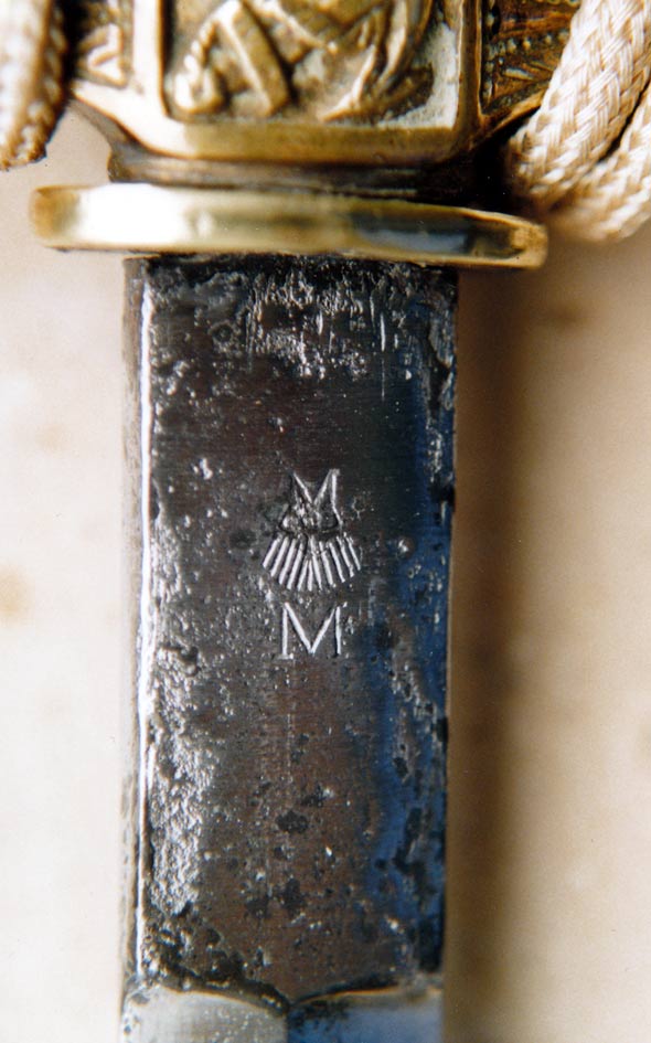 Auf der Klinge hingegen wird der ältere "M über Anker"-Stempel der vorläufigen Reichsmarine durch den neu darüber geschlagenen "M über Adler"-Stempel der Reichsmarine (nach 1921) ersetzt.