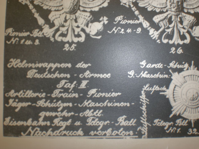 die 4 Tafeln (so komplett) stammen aus dem Werk "Die Helmwappen und Namenszüge der Deutschen Armee"; zusammengestellt von Paul Meybauer (P. M. !), Berlin, herausgegeben durch M. Ruhl, Leipzig, 1912.