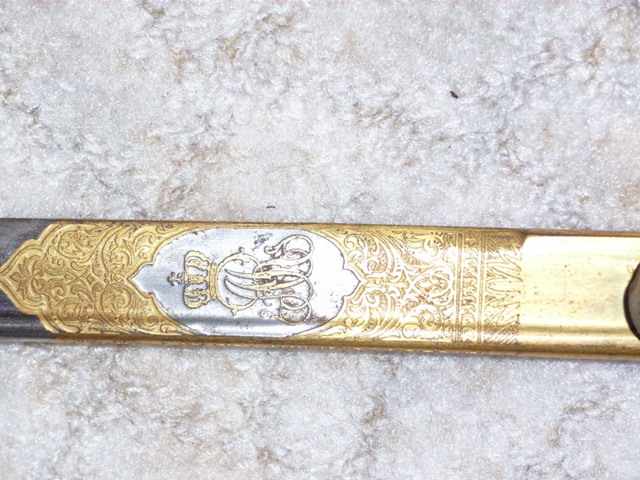 Dieser Säbel ist vermutl.in die Zeit des Mod. 1881 einzuordnen . Eisernes Bügelgefäß, mit Fingerhaken. Steckrückenklinge mit Schör. Terzseite, Ätzung Wappen mit der Inschrift " AR " ( Albert 1873 - 1902 ),Eisenhauer. Quartseite mit sächsischem Wappen,Vergoldung noch recht gut erhalten. Hilze mit Fischhaut, leider o. Wicklung. Gesamtl. ca. 99cm. Klingenl. ca.81 cm. Klingenbr. 3 cm. Eisenscheide, mit 2 Bändern u. 2 losen Ringen Eine genauere Bestimmung würde mich freuen. Gruß, sonjar