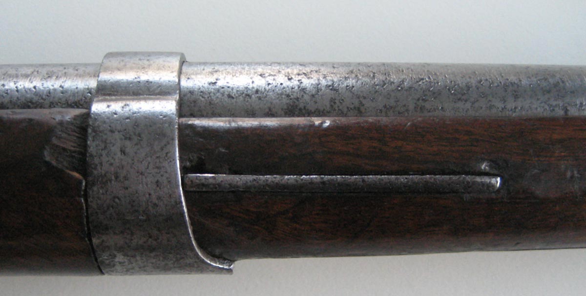 Faszinierend ist die Konstruktion: Das Holz wiegt fast nichts, aber die Metallteile (vor allem die Schaftkappe, der Lauf und das Schloss) sind sehr massiv. Die Konstruktion der Federn für die Laufring- und die Ladestockhalterung ist genial. Eine ergänzende Information: Unter dem Lauf sind zwei Stellen, die so aussehen, als hätte man ursprüngliche Metallnasen für Stiftbefestigung im Schaft entfernt. Von der Bajonett-Haft gesehen Richtung Mündung erkennt man am Lauf eine rechteckige Lötspur gleicher Größe (siehe