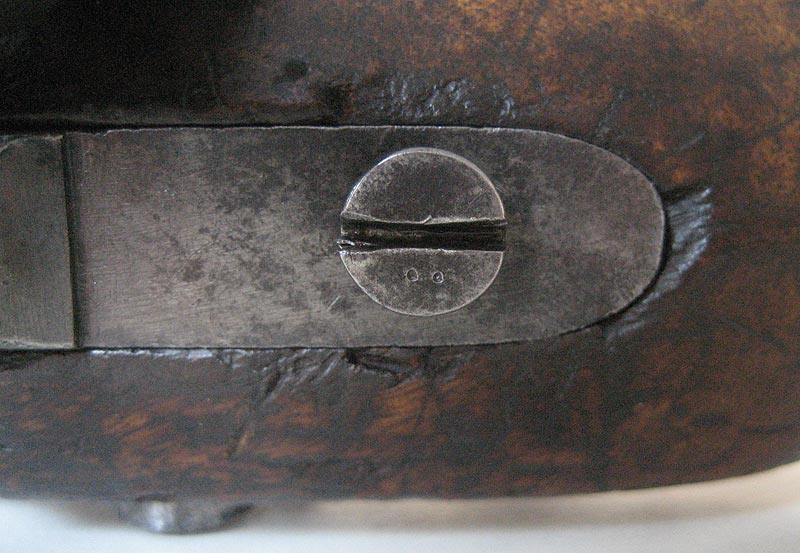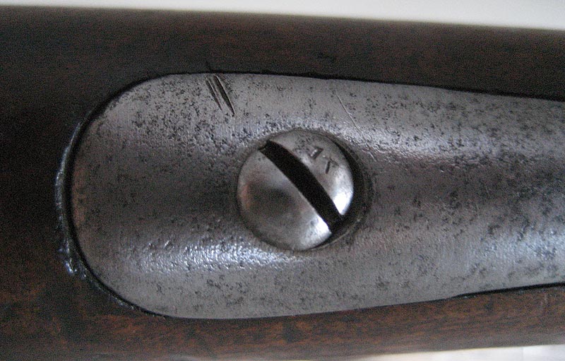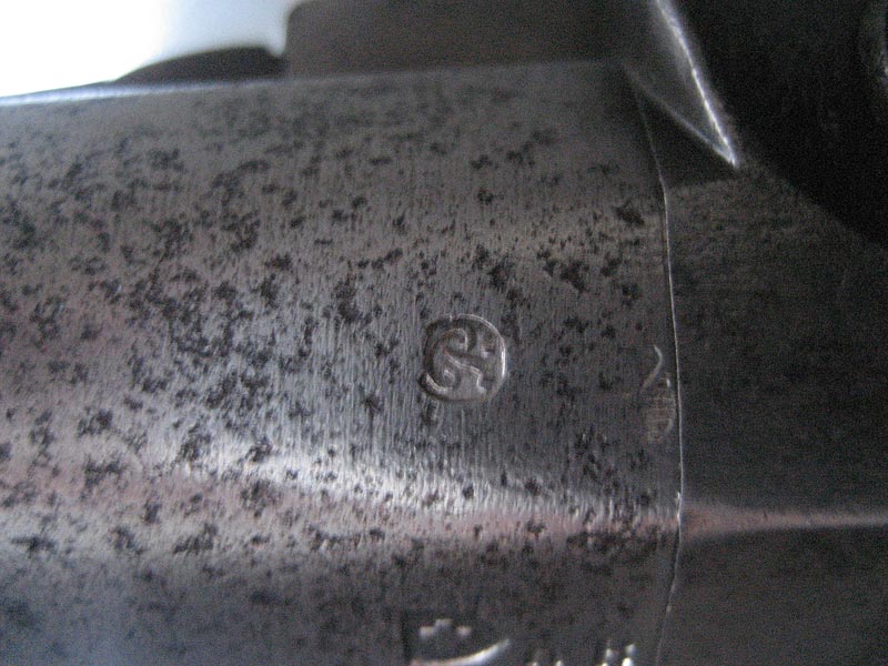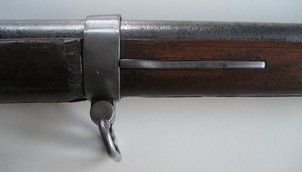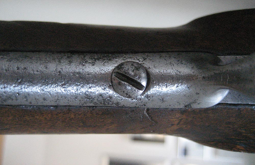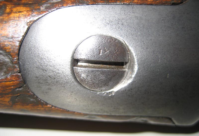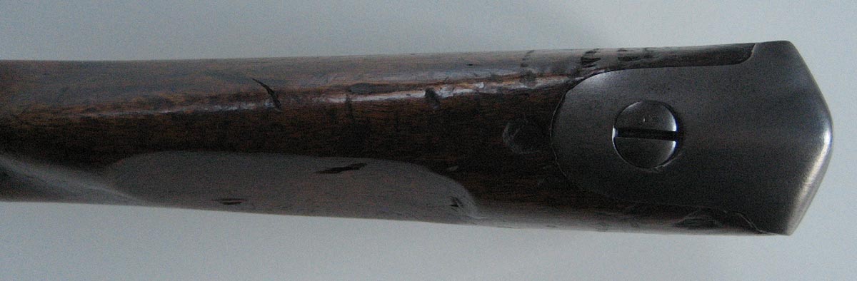 Auf der Unterseite des Laufes ist eine Zahl, im Stil der Zahlen auf den Ladestock, graviert: Eine 3 oder 8 meine ich zu erkennen. Am unterseitigen Markierungsstrich Schwanzschraube - Lauf ist ein "M" gestempelt. Auf dem mittleren und vorderen Laufring ein "L". Die Riemenöse am Handschutz scheint alt ersetzt.