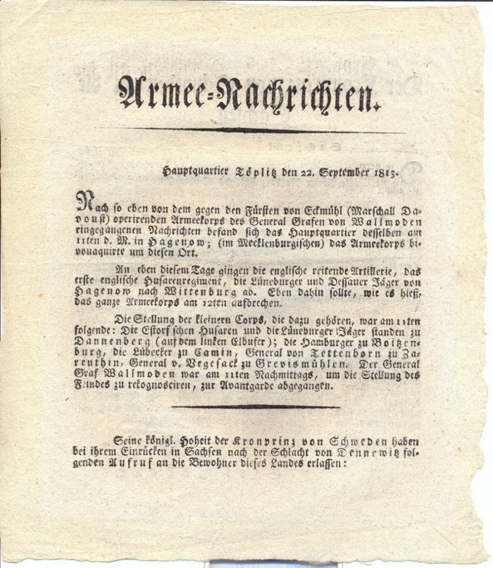 Hier die Armee - Nachrichten aus dem Hauptquartier in Töplitz vom 22. September 1813.