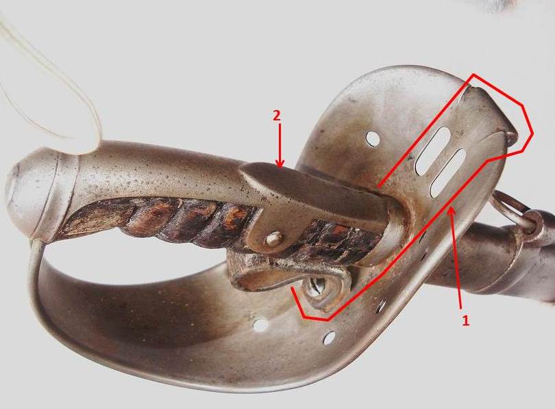 Die beiden Modelle unterscheiden sich von dem württembergischen, durch den Steg, der sich von der Fingerschlaufenschraube bis zum Endwulst am Korb durchzieht (1). Außerdem sind die Schlitze zur Aufnahme des Faustriemens beim Württemberger oval und bei den beiden anderen eckig (1). Die Griffkappe weist bei allen drei Modellen eine Daumenvertiefung auf(2).
