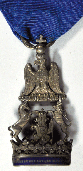 "Auf dem Ordenszeichen stand auf der Vorderseite der Schriftzug CHARACTER UND AUFRICHTIGKEIT und auf der Rückseite XXV. DEC. MDCCCIX geschrieben. Das Band war dunkelblau.