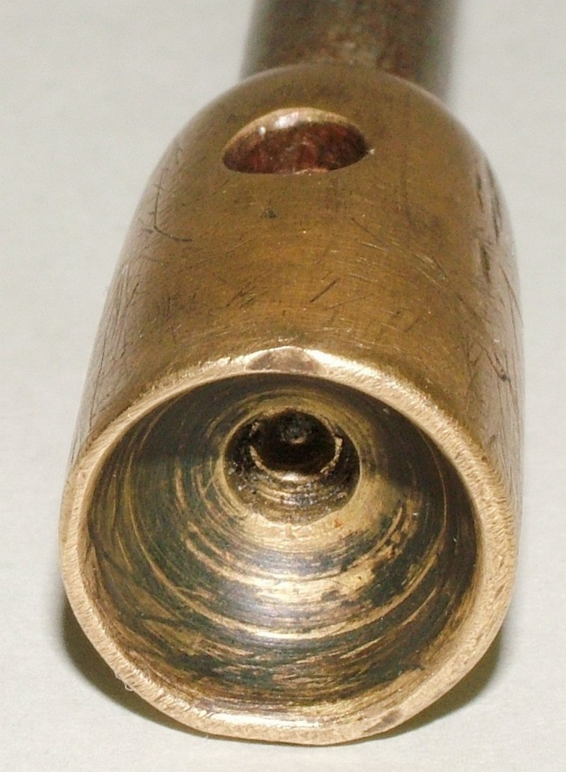 Der Messingkopf war für die Kugel der Stutzenpistole und der Stahlkopf für die Ladung der Flankörpistole gedacht.