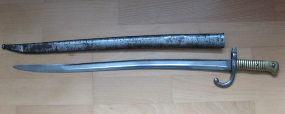 Hier ein französisches Bajonett Chassepot Mle. 1866, im Krieg 1870/71 erbeutet und an deutsche Landwehrtruppen wieder ausgegeben.