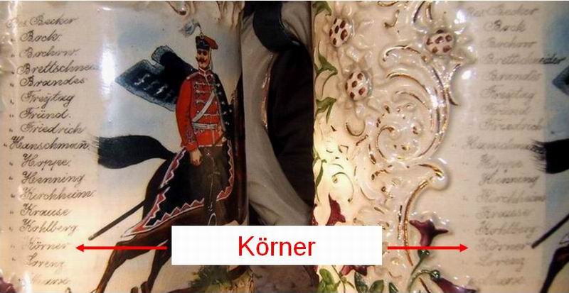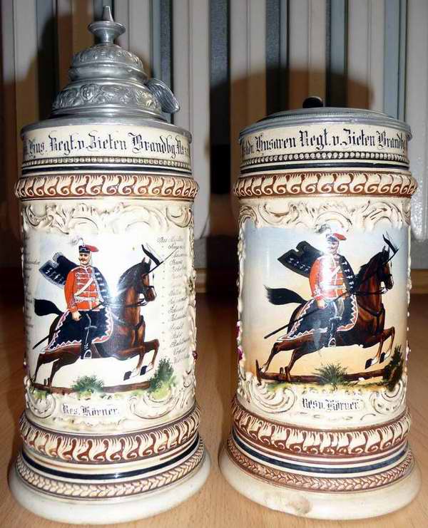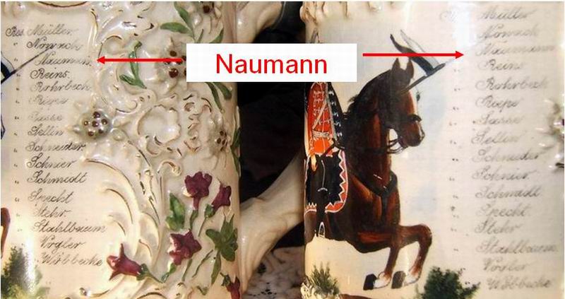 Die Reservisten Naumann und Körner haben sich vom selben Hersteller ihre Krüge fertigen lassen. Nur bei der Wahl des Deckels hatten sie unterschiedliche Geschmäcker. Naumann 's Krug hat als Drücker eine Husarenmütze, was an sich schon selten ist, aber der Zinndeckel ist zusätzlich noch vernickelt.