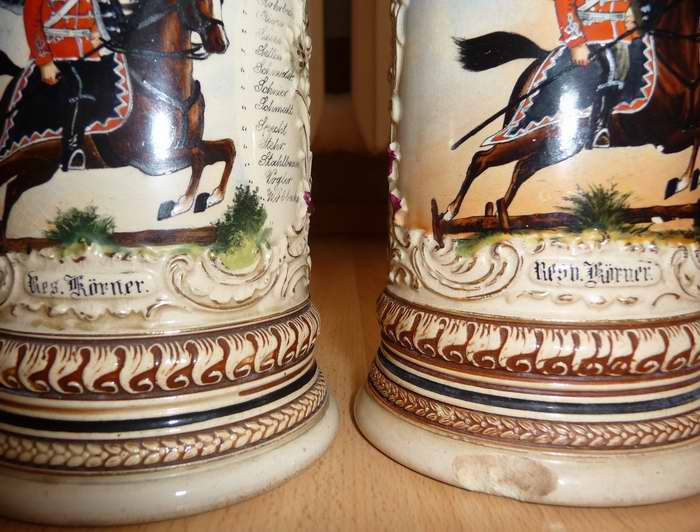 Der Seltenheit von Krügen aus einer Eskadron und einer Dienstzeit wird mit folgendem Beispiel noch getoppt. Zwei Krüge von einem Reservisten. Der Reservist Körner, von der 2. Eskadron der Dienstzeit 1897 bis 1900 war hier so nett.