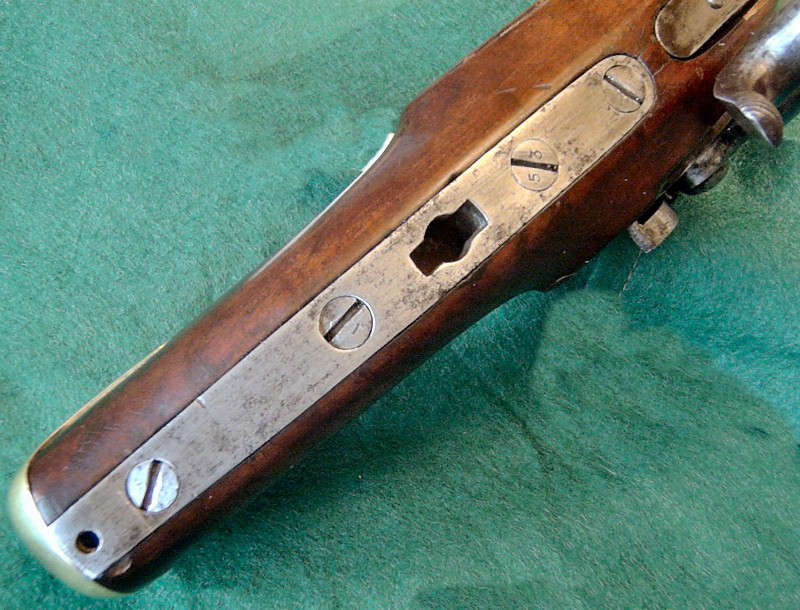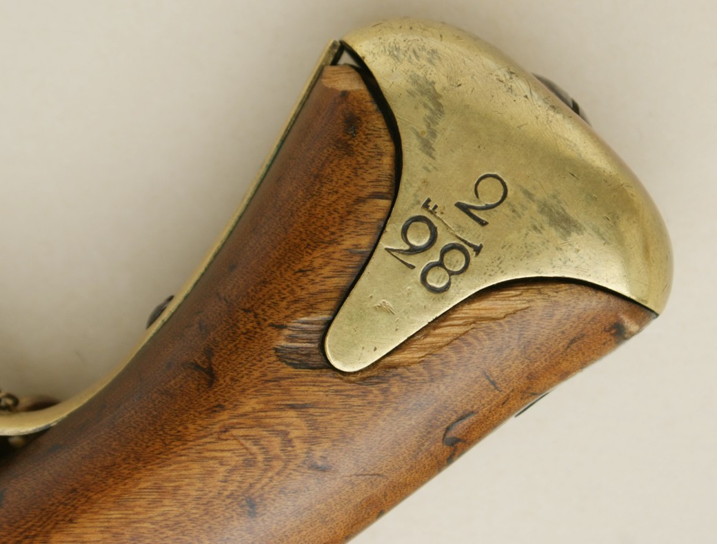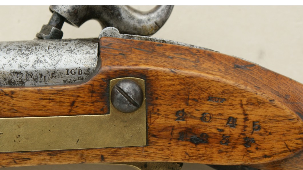 Leider sind hier Pistole und Anschlagkolben nicht nummerngleich. Sie passen aber aneinander (ist nicht immer so) und sind ungefähr vom gleichen Holz.