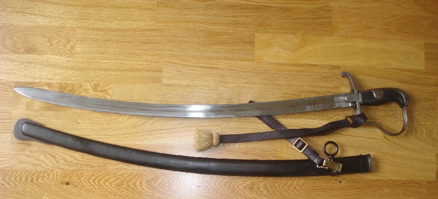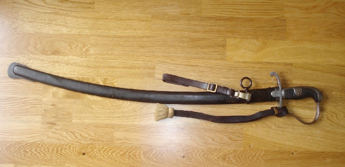 Zu der Aussage von Preussen muß man sagen, daß die Kürzung der Klingen nicht in den "siebziger Jahren", sondern erst nach der AKO vom 7. Mai 1896 erfolgte. Das vorliegende Stück ist also bereits in der kurzen Version hergestellt worden. Der Griff ist noch der ursprüngliche, also beledertes Holz, der dann ab 1907 in einen Hartgummigriff umgewandelt wurde.