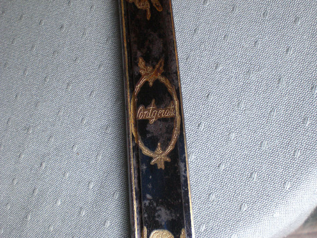 Ich möchte dem Forum gerne, den von mir kürzlich erworbenen o. g. Säbel, zur Ansicht vorstellen. Der ehem. Besitzer dieses Säbels ( auf der Klinge lesbar ), war Wimar Söntgerath, geb. 1773 auf dem Schemkershofe zu Inger bei Birk. W. S. starb am 18.01.1837 auf dem Quadenhofe und war unverehelicht. Eine Chronik des Hofes Rietschoß bei Honnef berichtet uns folgendes: Wimar Söntgerath war ein Bauernsohn, der im Streit mit seinen Eltern in den damals unruhigen Zeiten, zu den Soldaten gegangen und " mit den Oesterreichern retitiert " war und es dann zum Offizier gebracht hatte, er starb als Premirlieutnant a. D. Nun zum Säbel selbst. Der Säbel mit gebläuter Klinge u. vergoldeten unterschiedlichen Darstellungen, siehe Photos, hat ein Eisengefäß, dessen Griffbügel mit einem Perlenschnurdekor belegt ist, unterbrochen von einem Medaillon mit überkröntem Adler.Die Parierlappen sind ebenf. mit einem Perlenschnurdekor belegt, die Parierstange n. vorn geneigt mit rundem Abschluß. Die Griffhilze aus Leder / Horn ? ist mit zweifachem Kupferdraht verdrillt. Der Griffkappenvernietung ist Rautenförmig u. ungeöffnet.Der nicht gebläute Klingenabschnitt ist nicht poliert, sondern weißfarben mattiert u. beiderseits, mit mit jeweils im Wechsel durch 4 Blüten u. 4 Rauten, diese bestehend aus 9 Punkten verziert, die Klingenspitze ist hechtzungenförmig. Quartseitig, die Figur über dem Adler gleicht einem Engel. Die Scheide mit 2 Bändern u. 2 bewegl. Ringen versehen, deren Befestigungen zehnkantig gearbeitet sind. Die Maße des Säbels: Gesamtlänge 102.5 cm. Klingenlänge 86.5 cm. Klingenbreite 3.00 cm. Scheidenl. 90 cm. Für jede Unterstützung bezügl. einer genaueren Zuordnung wäre ich dankbar... Gruß, Sonjar