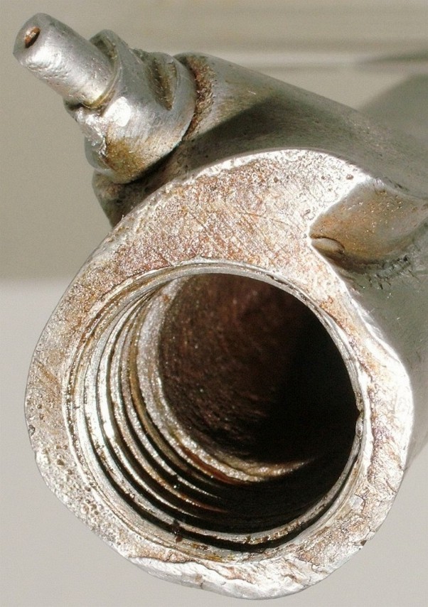 abgebrochen. Man kann aber deutlich den Ansatz des Dornes erkennen. Am Anfang meines Sammlerlebens wollte ich unbedingt wissen, wie so ein Dorn aussieht. Ich habe also den Lauf fast ein halbes Jahr in Öl mit guter
