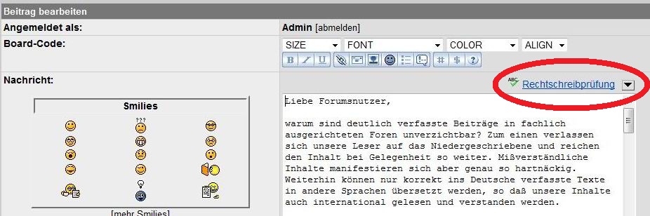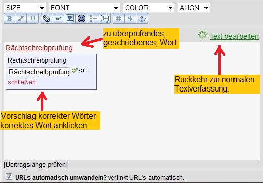 Wer sich nicht sicher ist ob sein Text korrekt ist, sollte den Text vor dem Absenden mit der Option "Rechtschreibprüfung" überprüfen und entsprechend bearbeiten.