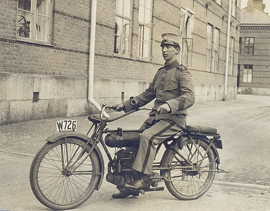 Er posiert auf einer Cleveland Modell 1917. Zugelassen war sie zu der Zeit in der schwedischen Provinz Dalarna, zu erkennen am "W" auf dem Kennzeichen.