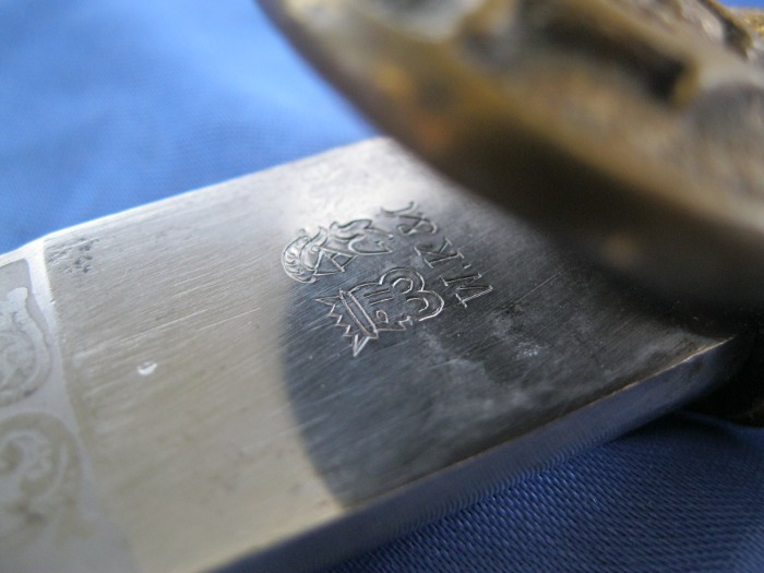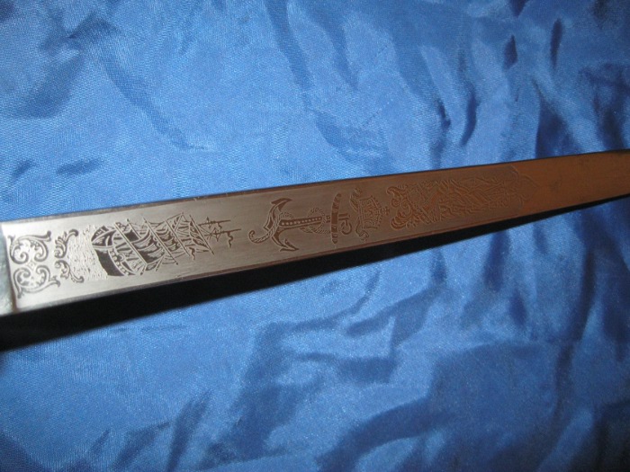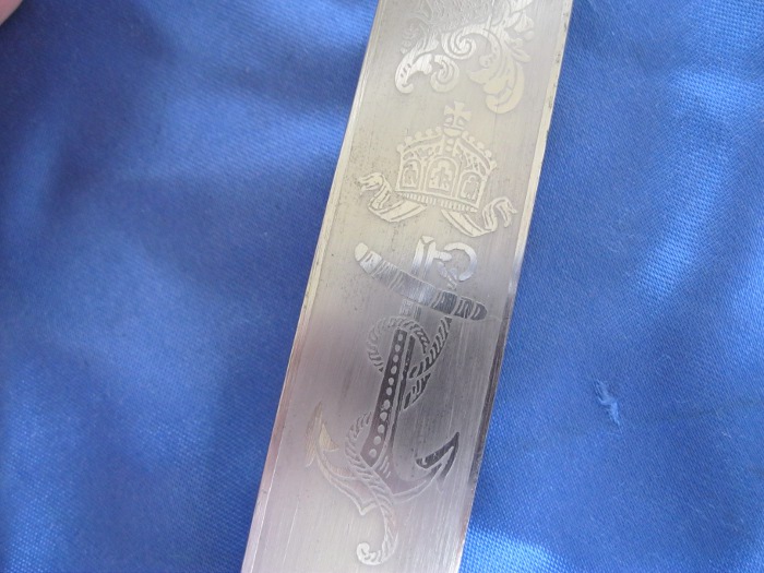 Die Klinge weist die üblichen Zierätzungen mit unklarem Anker von Kaiserkrone überkrönt, Waffenstaffagen und Segelschiffätzungen auf.