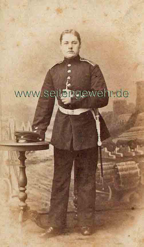 Der hier abgebildete Einjährig Freiwillige dürfte der Fußabteilung des Feldartillerie Regt. Nr. 9 angehört haben. Das lange Seitengewehr und die fast portepeemäßige Troddel suggerieren einen erheblichen höheren Dienstgrad. Mehr Schein als Sein! Also mehr die Selbstdarstellung eines zahlungskräftigen Soldaten.