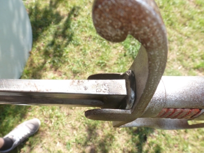 Die einzigen, sichtbaren Stempel befinden sich auf dem Klingenrücken. Alles andere verschwindet unter einer dicken Schicht Farbe!